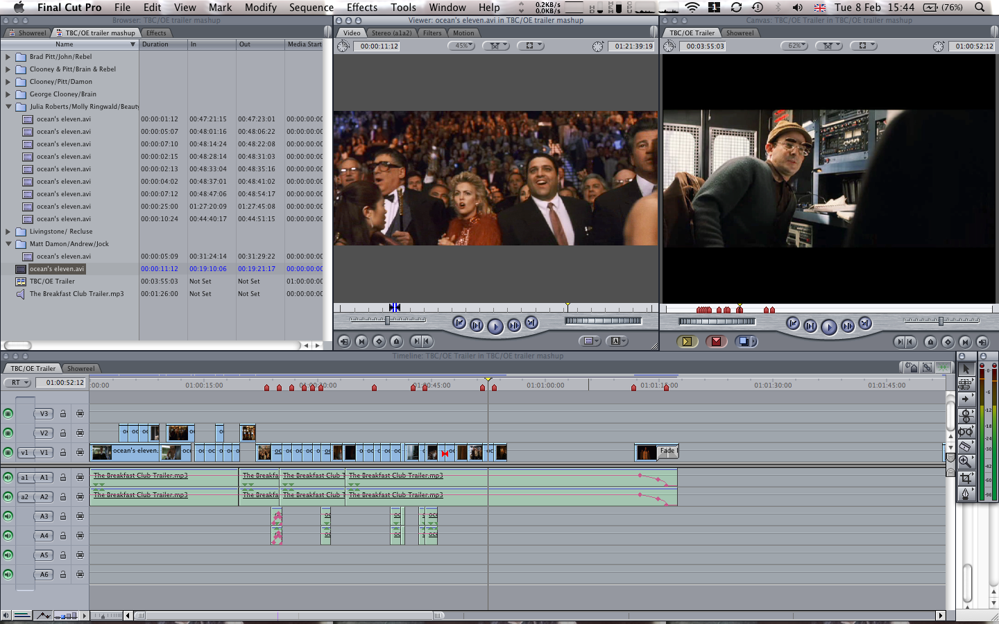 At the moment I’m working on my mashup trailer of Ocean’s Eleven and The Breakfast Club, a strange sounding mix I know…but the results are pretty funny. As I’m sure I’ve discussed before, I’m using the audio from The Breakfast Club trailer, and mashing it with the video from Ocean’s Eleven. It’s not as weird as it sounds, I promise, and the characters line up pretty well. The main challenge is syncing their mouths to make it look like they’re saying something totally different from what they actually are!