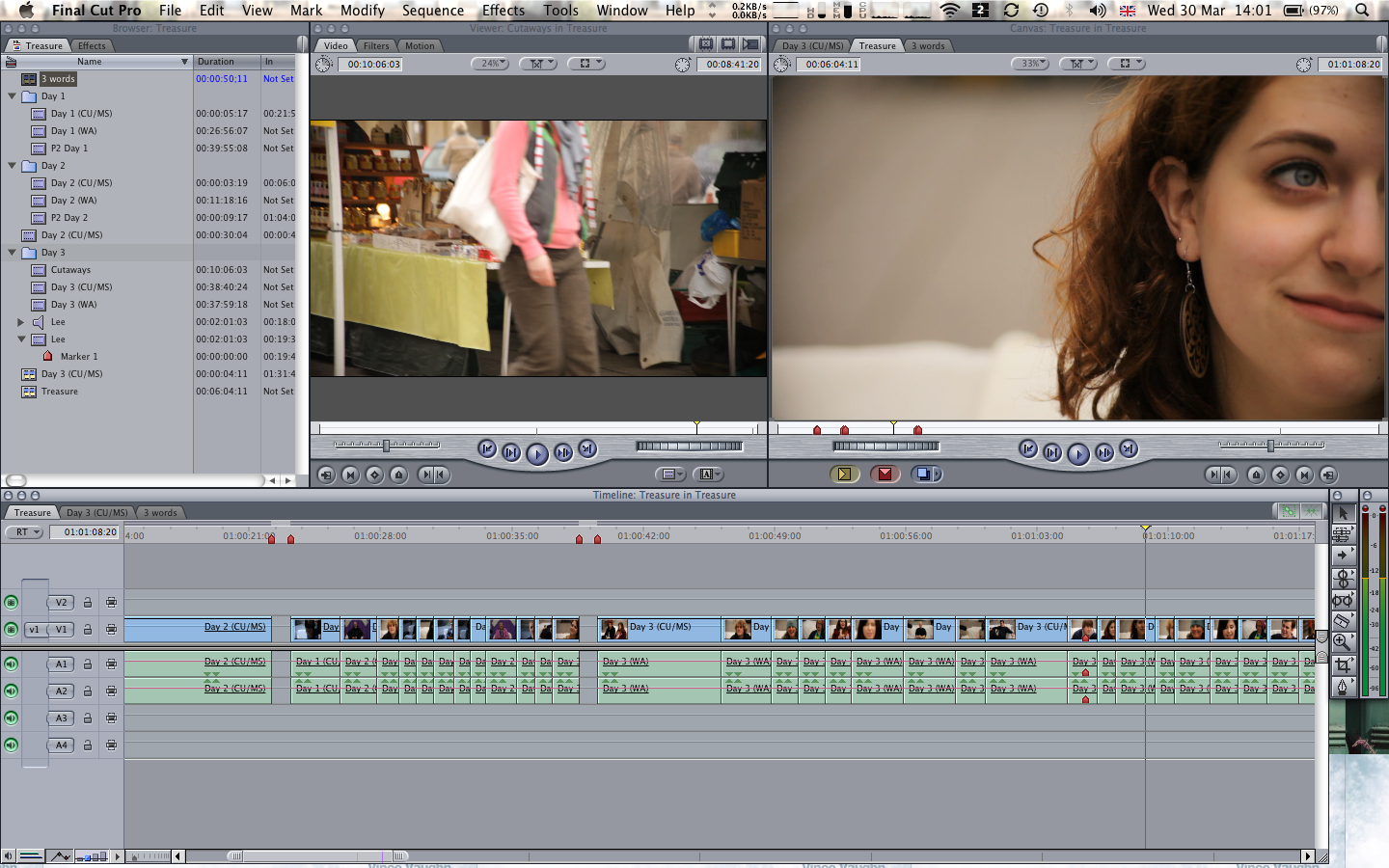Now that my dissertation is finally handed in, I’ve been able to make a proper start on the edit of Jade’s documentary, which for now has the working title of ‘Treasure’. I spent a good few hours doing the somewhat tedious job of organising the footage; making sure all the sequence settings were correct and matching up some missing audio. But now I’m on to the good stuff, cutting up people’s responses, creating funny, honest and often emotional moments as our interviewees were captured reflecting upon their lives and their possessions.