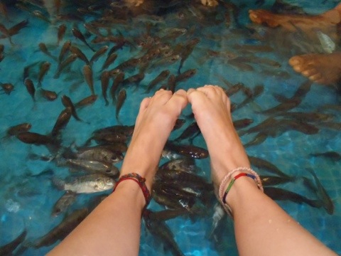 After quite a heavy night, we woke up pretty late. Luckily our hostel served breakfast until 12:30pm, so after a few coffees and slices of toast we were ready to explore the city. Our first port of call was the Central Market, where we somehow found ourselves sitting with our feet in a bath of water, with (pretty big) fish nibbling at our toes…needless to say, with my ticklish feet, I didn’t particularly enjoy this activity! Next up if was time to head back to the street market from the night before for a few cheap purchases of sunglasses, watches and headphones.
