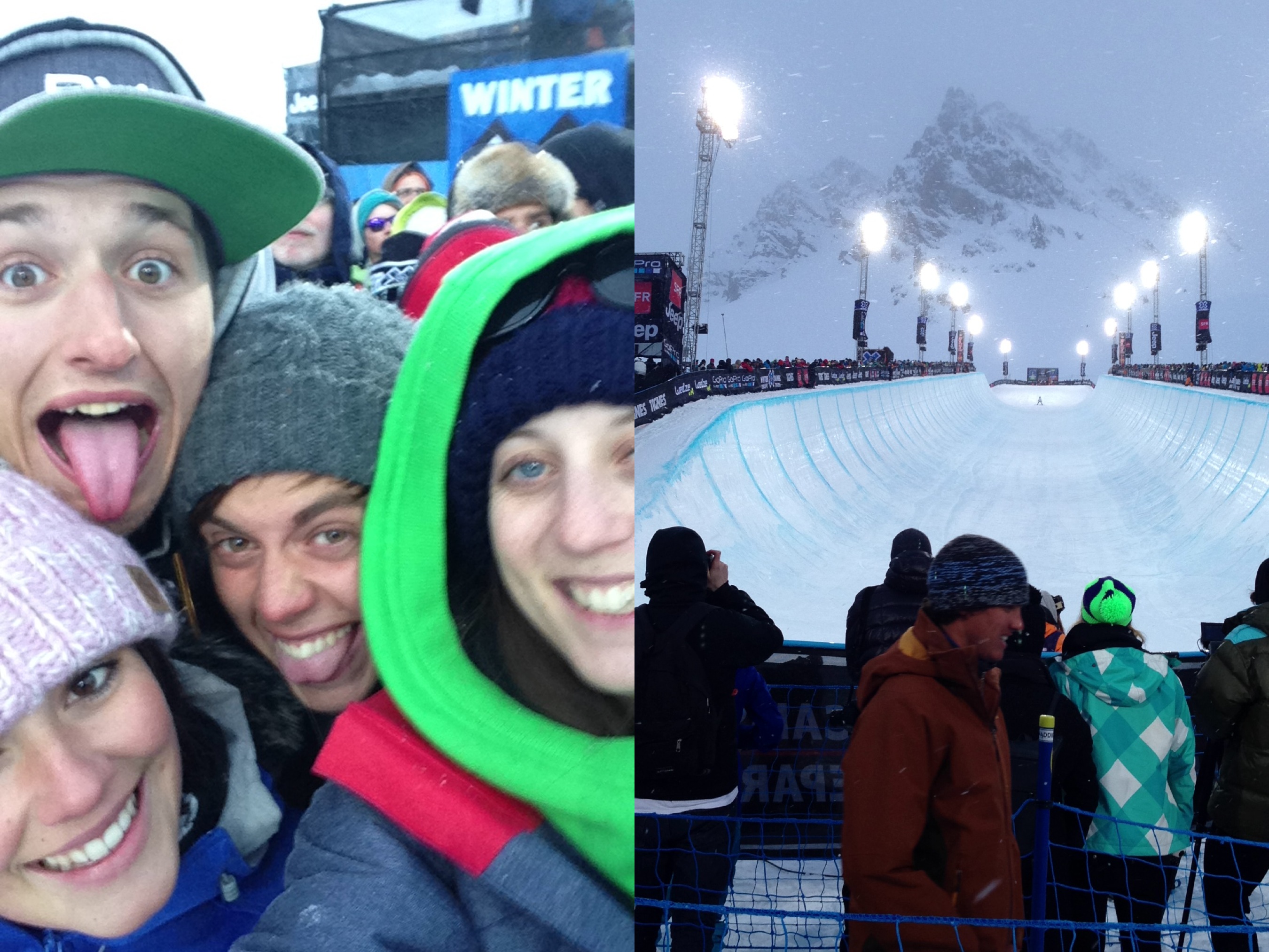 As you may have read in my latest Natives post, this week I got the chance to go over to Tignes for the opening day of the 2013 European X Games. And even though it snowed ALL day, it was freezing cold and the Womens’s Slopestyle (mahoosive jumps) got cancelled because of the weather, it really didn’t matter. Because at about 5pm we got right to front (and right in the middle) of the Superpipe for the Men’s snowboarding event. And it was EPIC. I genuinely don’t understand how those guys can hurtle up and down this pipe, throwing themselves high into the air, spinning and grabbing and flipping as they go. Mental. But incredible to watch.