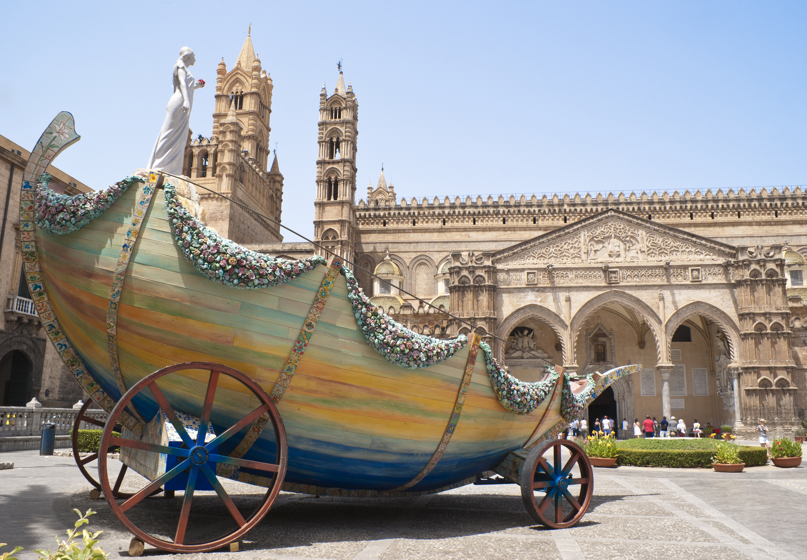 The so-called “Festino”, the big celebration in honour of Saint Rosalia, takes place from 13th to 15th July and it is basically a reinterpretation of that solemn procession, with people carrying the relics of the Saint, called Santuzza, throughout the whole city. For this event, on the very first day of this festival, citizens build a big barge with the statue of the saint covered with a veil in the square in front of the Cathedral. The veil is removed with the beginning of the celebrations, which includes prayers, sermons, masses, hymns and even concerts that gather all the population. The day after, on 14th July, the barge leaves the square in procession after a mass to thank the saint for the miracle over the plague, and it reaches the Foro Italico and the Quattro Canti, the centre of Palermo. And here the fun begin: when the float reaches the Foro Italico, there are fireworks and singing which will make you shiver.
